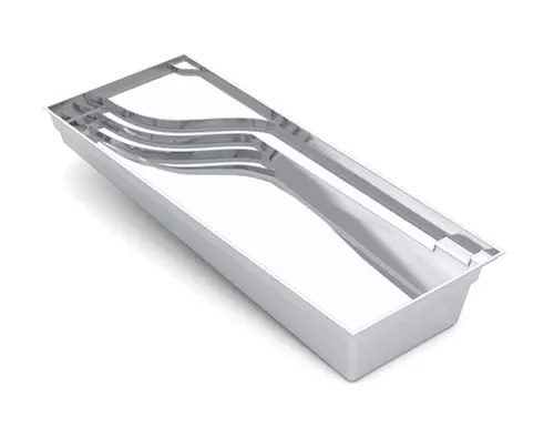 One of our European style inground fiberglass swimming pools, this features a distinctive and eye-catching high-water line. It allows the water in your pool to be almost to the very top of your pool creating a visually stunning swimming pool design. Style and function in one pool.